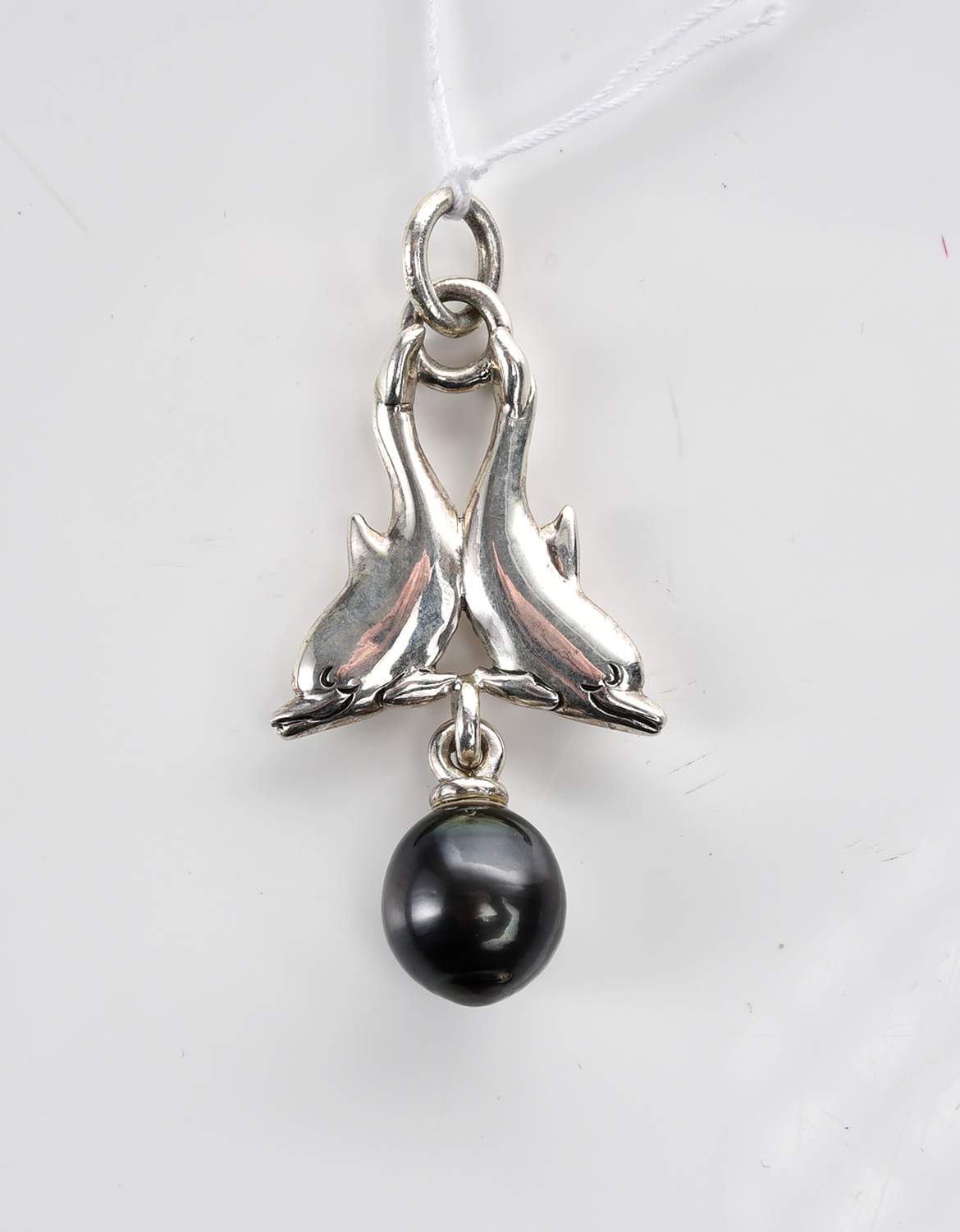 A TAHITIAN PEARL SET DOLPHIN PENDANT IN STERLING SILVER, THE PEARL MEASURING 11.5MM, LENGTH OF THE PENDANT 5CM