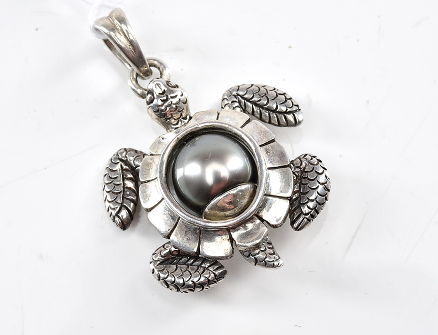 A TAHITIAN PEARL PENDANT FEATURING A TURTLE IN STERLING SILVER, TOTAL LENGTH 35MM