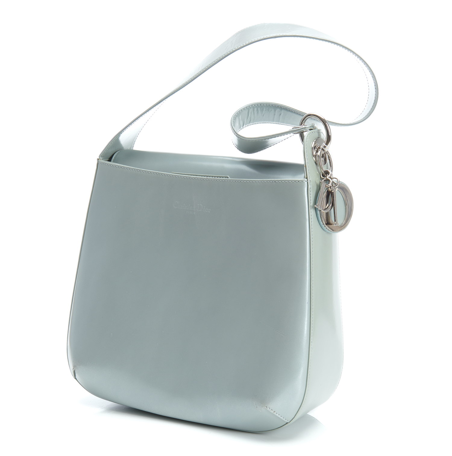 Styled in light grey patent leather with silver metal hardware and Dior charm, 26 x 21 x 9cm.