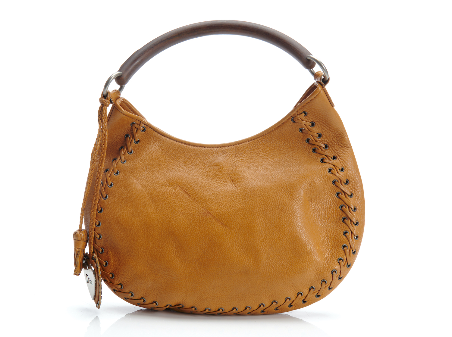 Styled in grained camel coloured calf leather with wooden handle and silver metal hardware, 32 x 23cm.