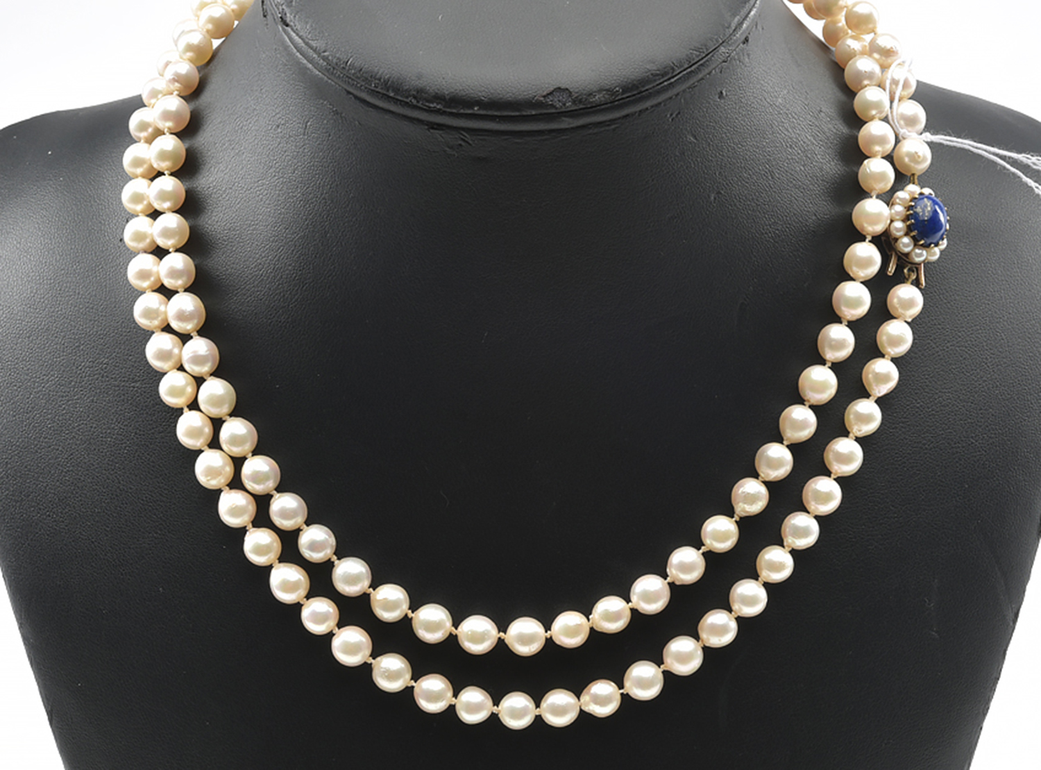 A STRAND OF CULTURED PEARLS, THE CLASP SET WITH LAPIS-LAZULI, TOTAL LENGTH 900MM