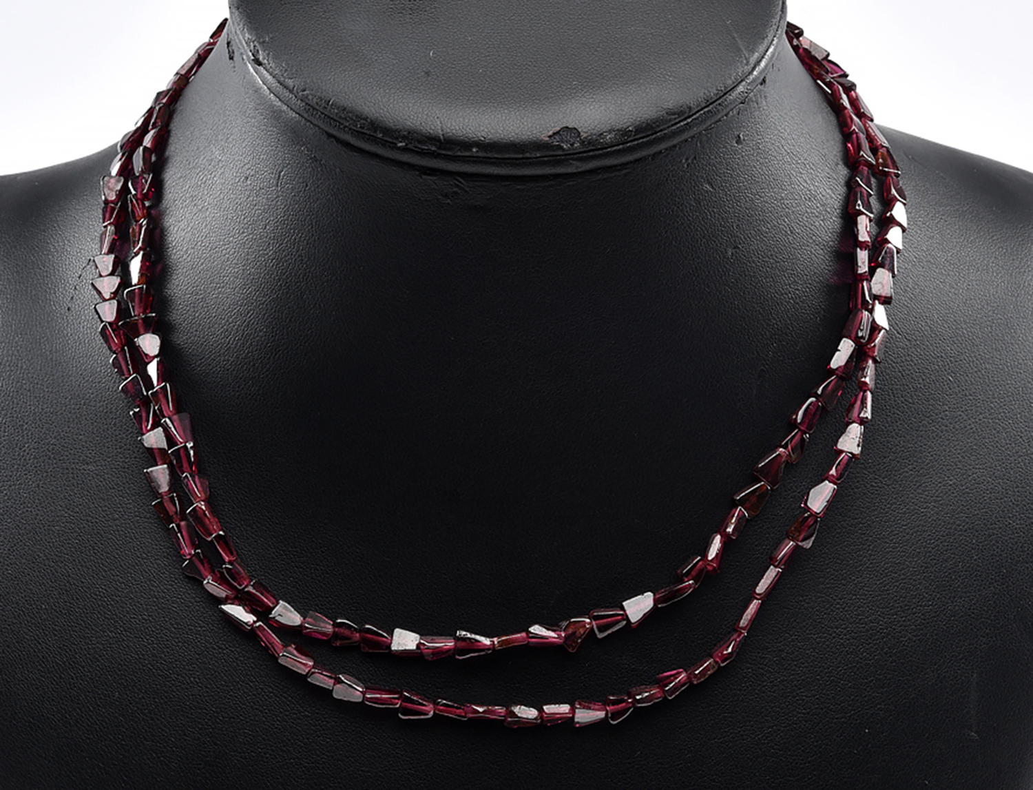 A VINTAGE DOUBLE STRAND FANCY CUT GARNET NECKLACE, TOTAL LENGTH 400MM