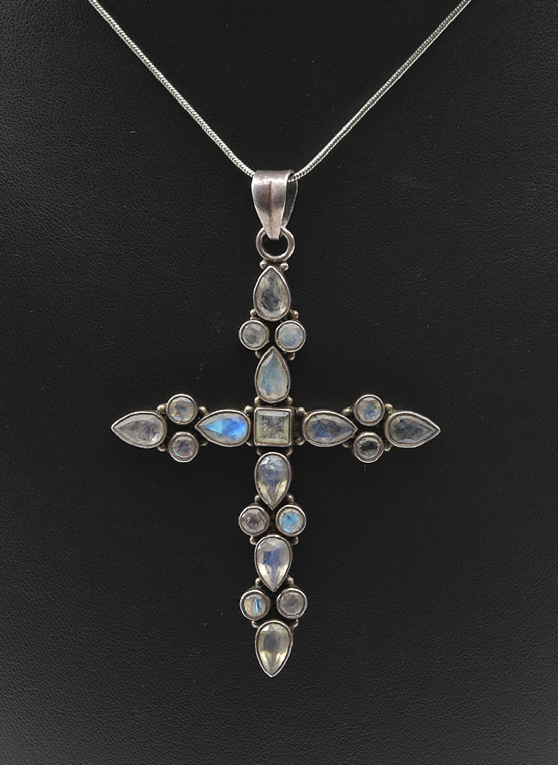 AN ANTIQUE STYLE PASTE SET CROSS PENDANT IN SILVER, WITH CHAIN, LENGTH OF THE CROSS INCLUDING BALE 75MM