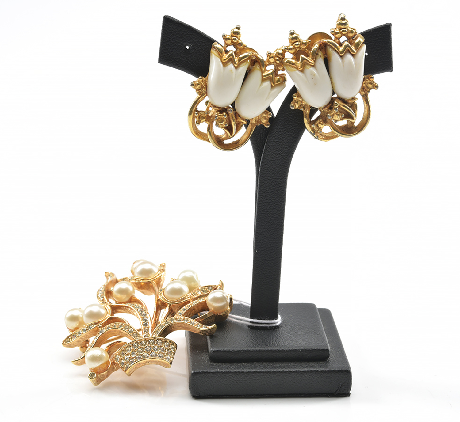 A 1980-90s FLORAL BROOCH SET WITH FAUX PEARLS AND PASTE BY MARVELLA, TOGETHER WITH A PAIR OF CLIP EARRINGS