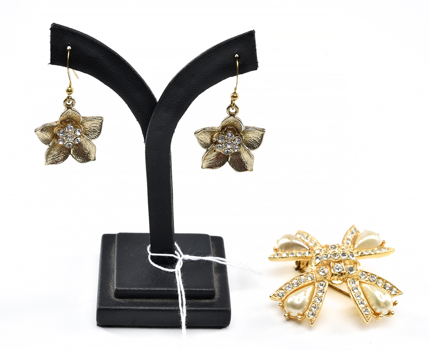 A VINTAGE COSTUME BROOCH, TOGETHER WITH A PAIR OF FLORAL EARRINGS, A/F