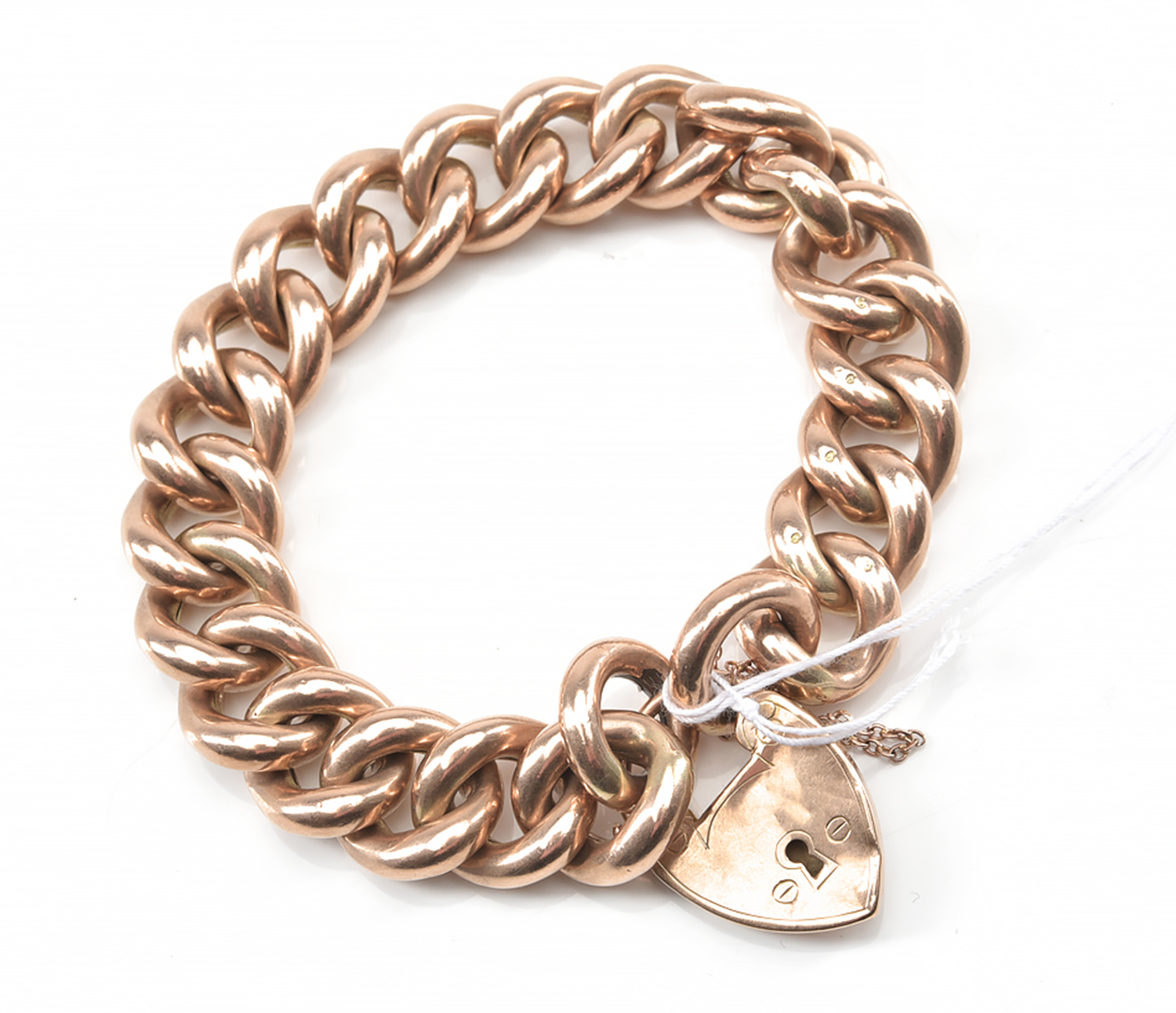 AN ANTIQUE AUSTRALIAN COPPER FILLED CURBLINK BRACELET WITH A HEART PADLOCK IN 9CT ROSE GOLD BY WILLIS & SONS