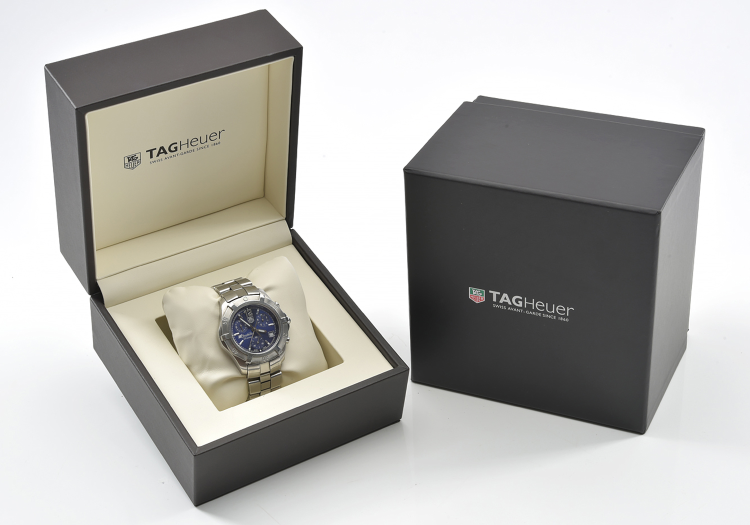 A SEYCHELLES LIMITED EDITION CHRONOGRAPH QUARTZ WRISTWATCH BY TAG HEUER, BLUE DIAL, CASE DIAMETER 41MM, MODEL CN111D, SERIAL No TY2709 2845/3000, WITH BOX AND PAPER