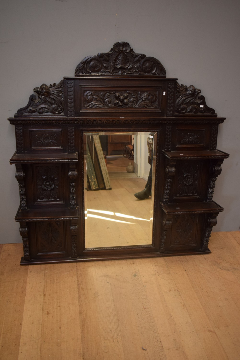 A DECORATIVELY CARVED OAK OVERMANTLE MIRROR (A/F) (148H X 139W CM)