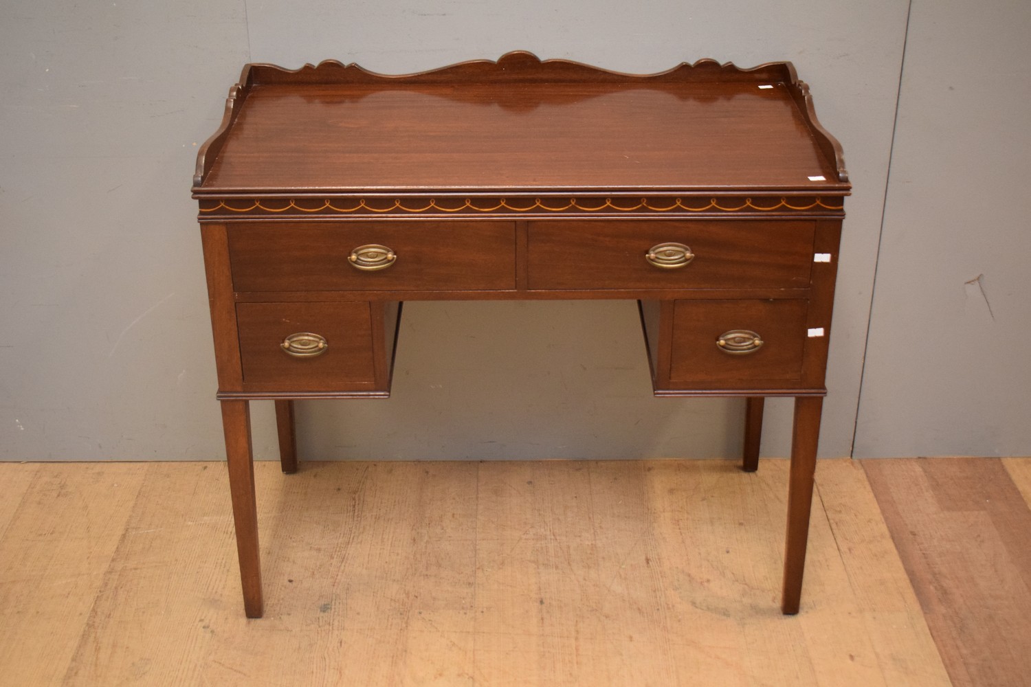 A MAHOGANY INLAID FOUR DRAWER WRITING DESK (81H X 93W X 48D CM)