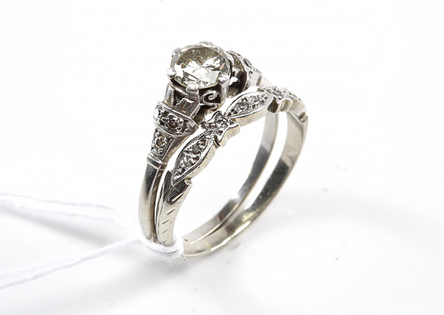 A VINTAGE OLD EUROPEAN CUT DIAMOND SOLITAIRE RING OF APPROXIMATELY 0.77CTS, IN 18CT WHITE GOLD AND PLATINUM, TOGETHER WITH A DIAMOND SET WEDDING BAND IN 18CT WHITE GOLD AND PLATINUM, BOTH RING SIZE P, 4.9GMS
