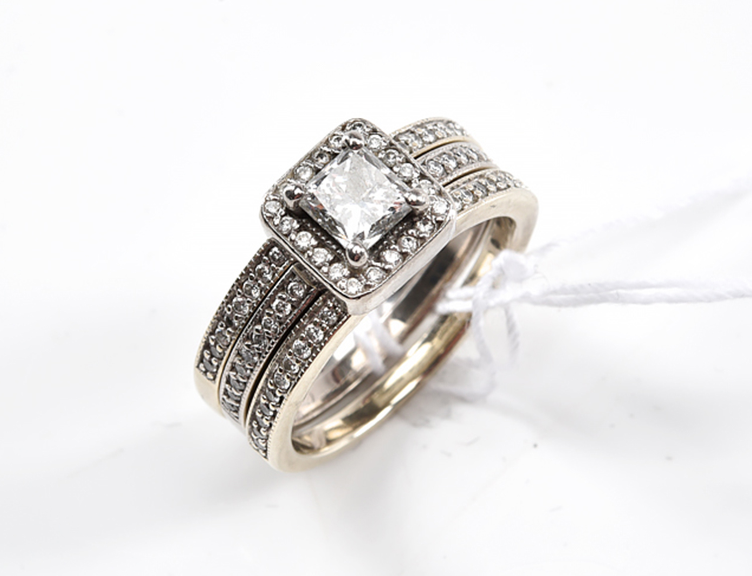 A DIAMOND SET CLUSTER RING, CENTRALLY SET WITH A PRINCESS CUT DIAMOND OF 0.71CTS, TOGETHER WITH TWO DIAMOND SET BANDS, ALL IN 18CT WHITE GOLD, RING SIZE N, 9.8GMS, GIA LASER INSCRIBED 6127407908 - COLOUR E/VS2