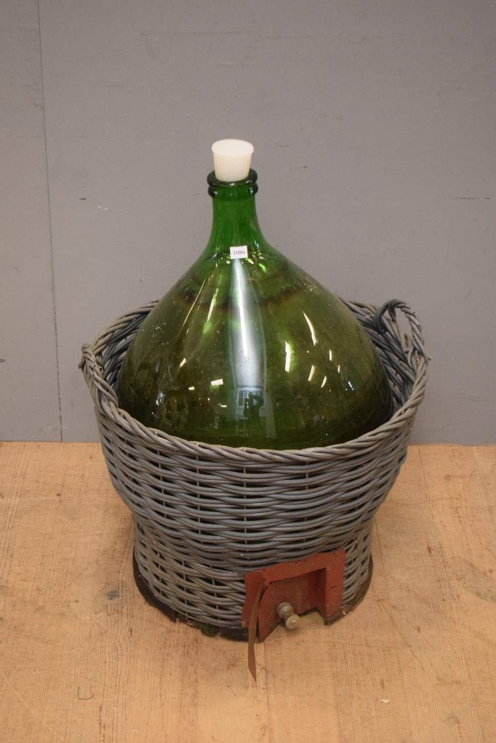 A GREEN GLASS DEMIJOHN IN A CANE BASKET (77 CM H)