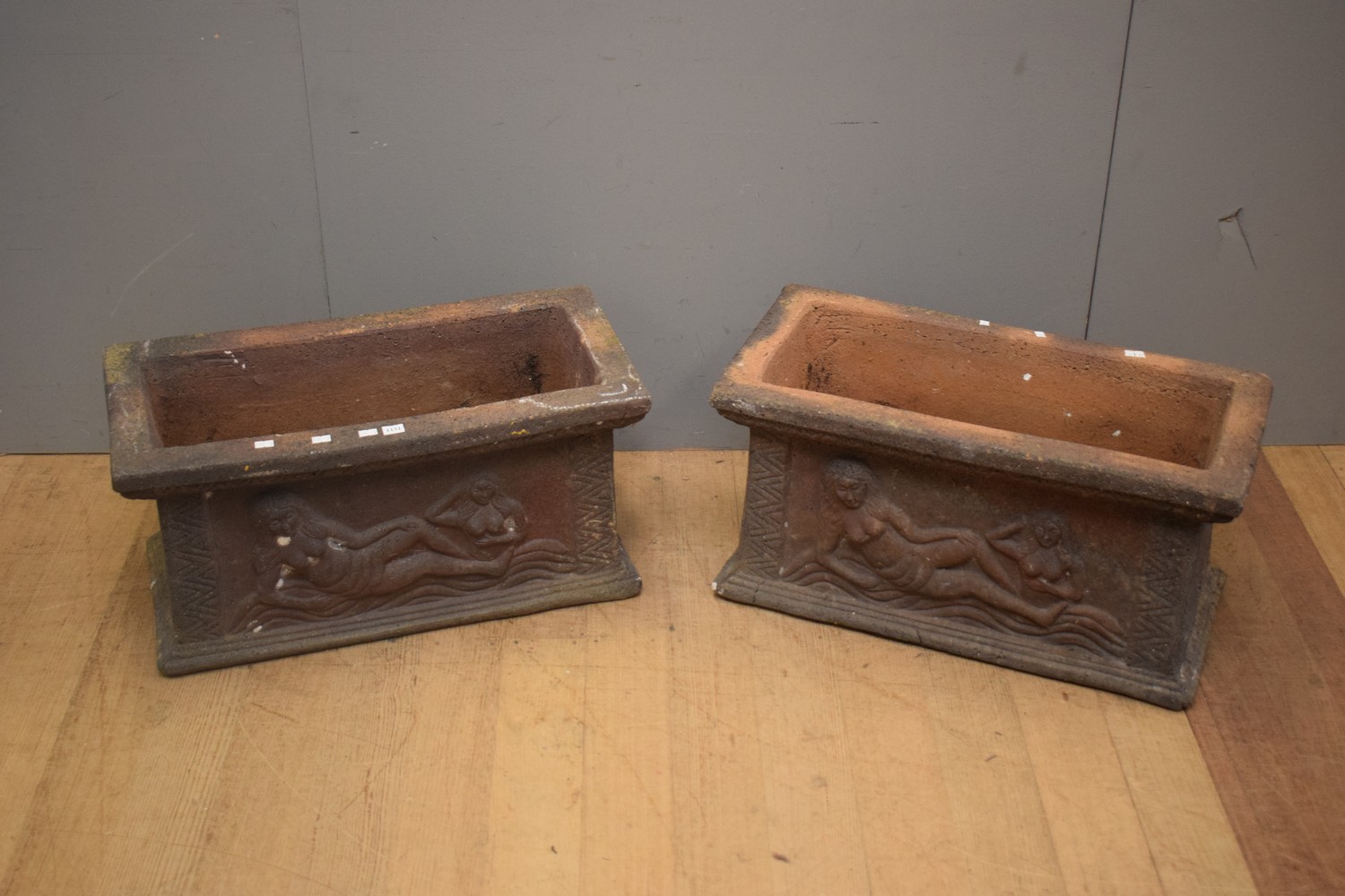 A PAIR OF DECORATIVE TERRACOTTA PLANTERS (33H X 65W X 32D CM)