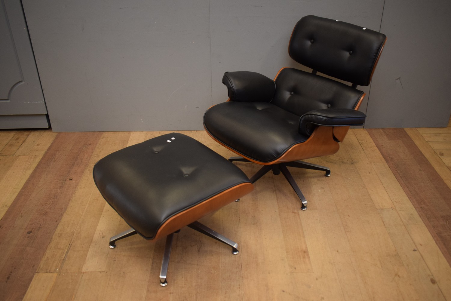AN EAMES STYLE ARMCHAIR AND OTTOMAN (A/F) (CHAIR 85H X 86W X 83D CM)