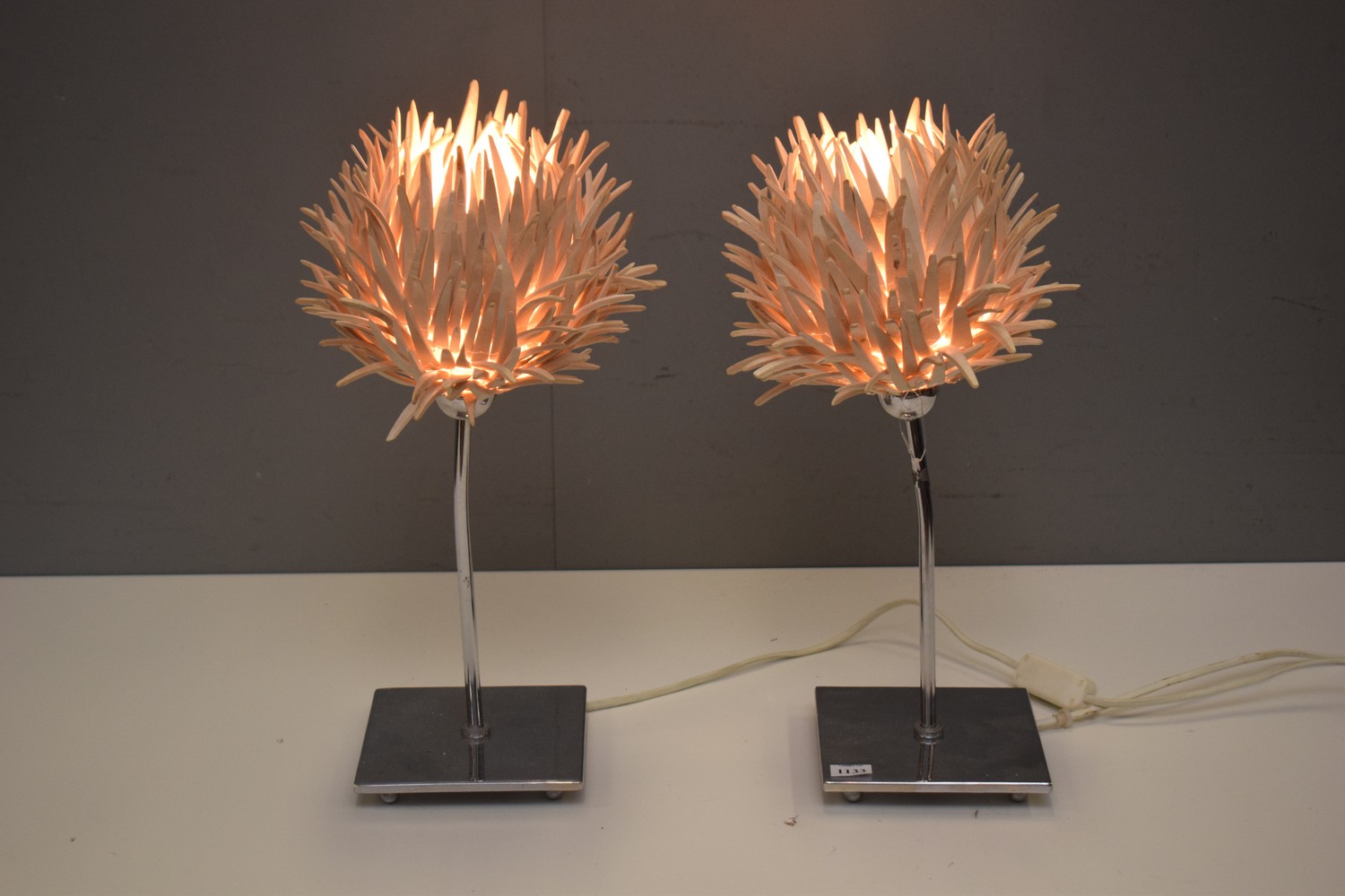 A PAIR OF COCONUT HUSK CONTEMPORARY LAMPS WITH CHROME BASES (A/F)