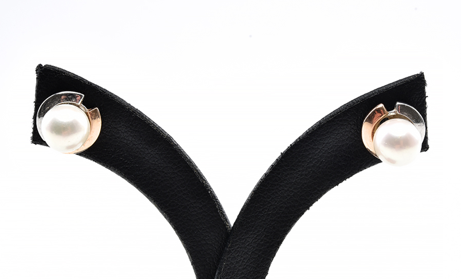 A PAIR OF CULTURED PEARL STUD EARRINGS IN TWO TONE 18CT GOLD
