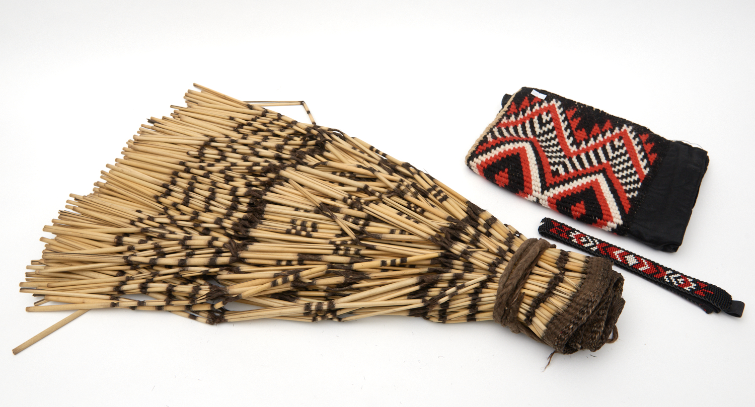A NEW ZEALAND MAORI KAPA HAKA OUTFIT COMPRISING FLAX PIUPIU SKIRT, WOOLLEN EMBROIDERED TOP AND HEADBAND