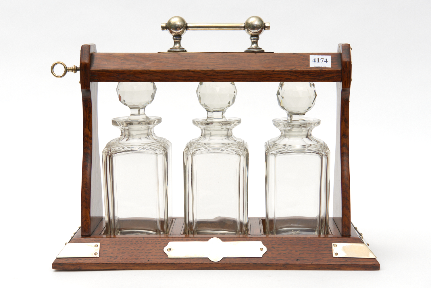 TANTALUS THREE DECANTERS WITH SILVERPLATED MOUNTS AND KEY