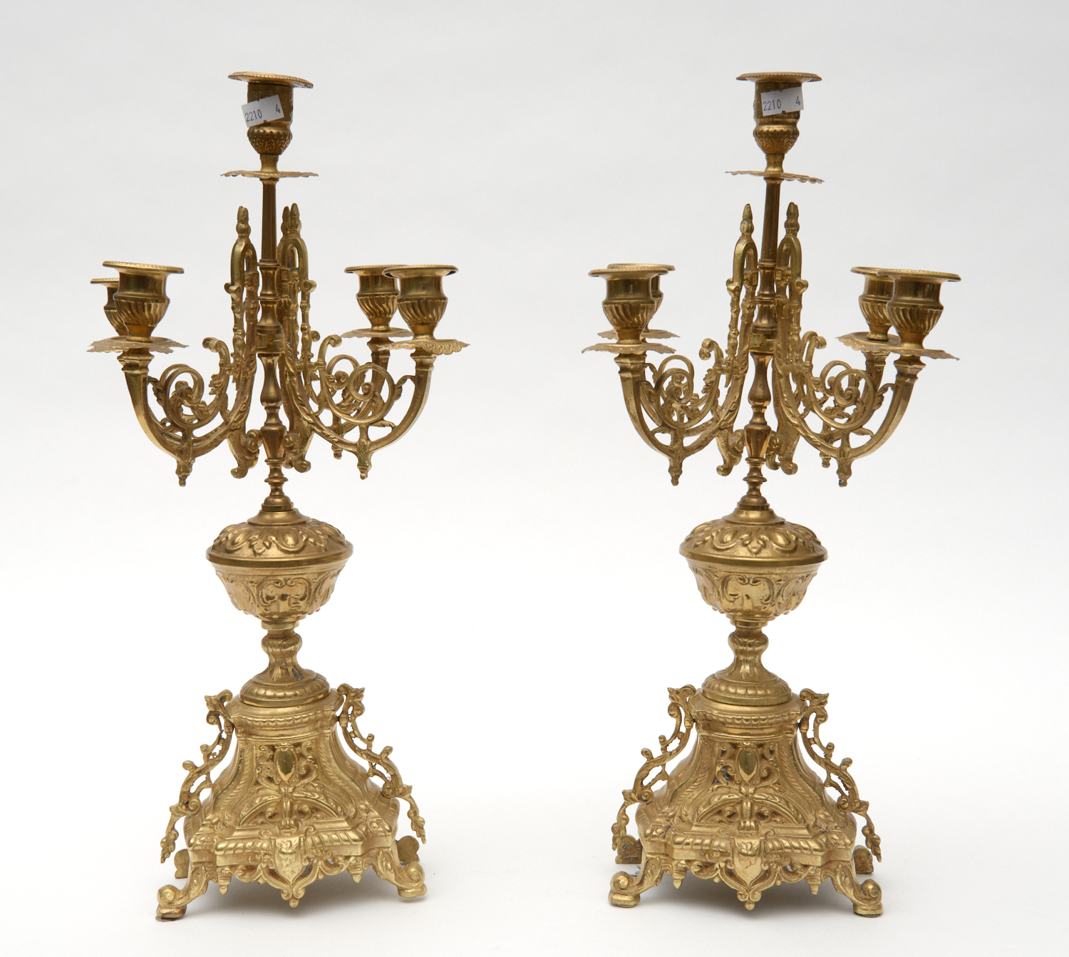 A PAIR OF BRASS MULTIBRANCH CANDLESTICKS