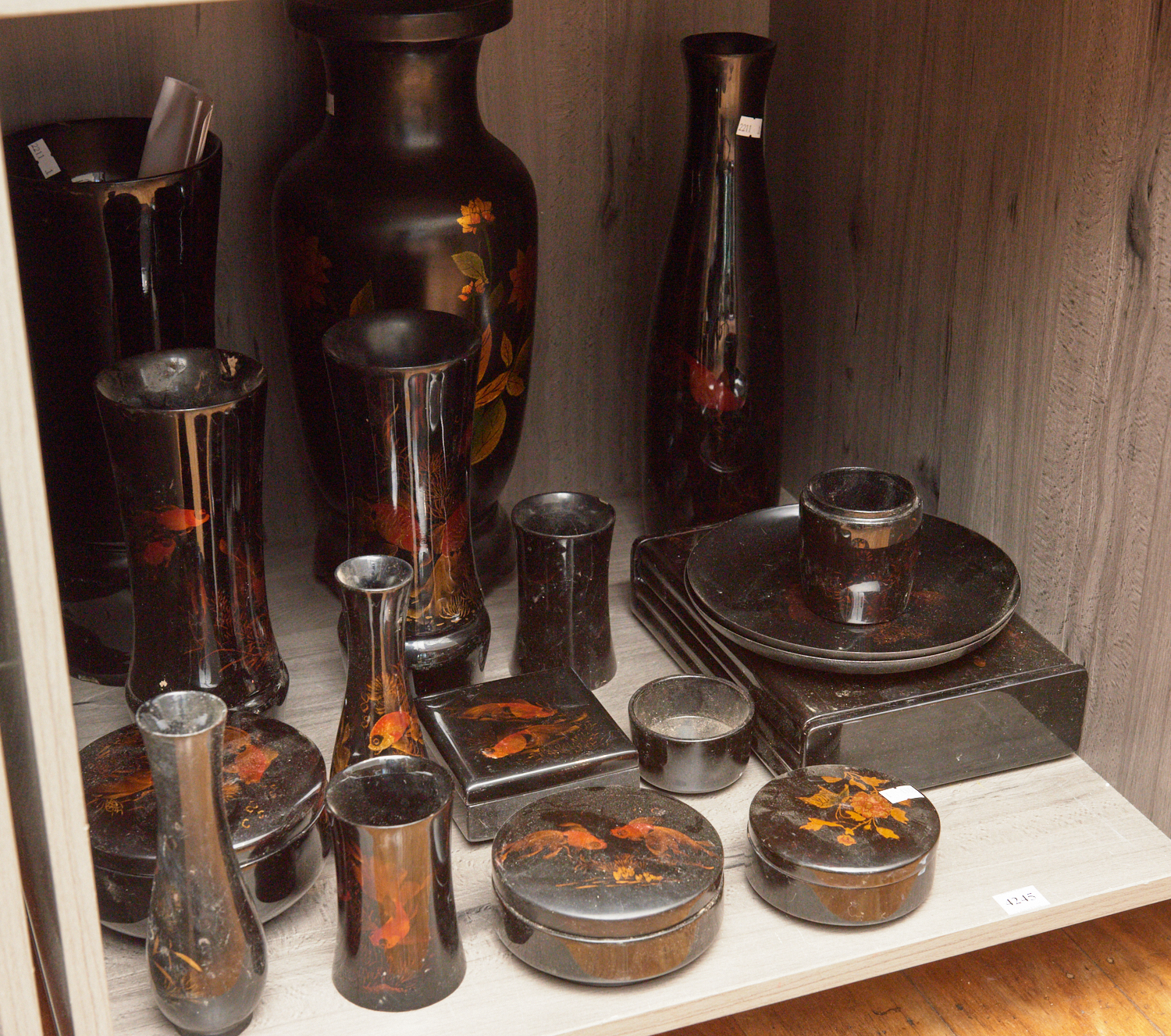 A COLLECTION OF VIETNAMESE LACQUERWARE INCLUDING VASES, PLATES AND CONTAINERS