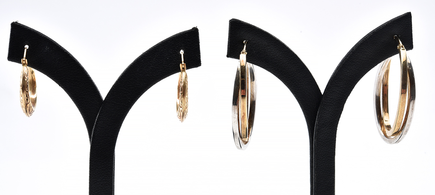 TWO PAIRS OF HOOP EARRINGS IN 9CT GOLD AND STERLING SILVER, 5.3GMS