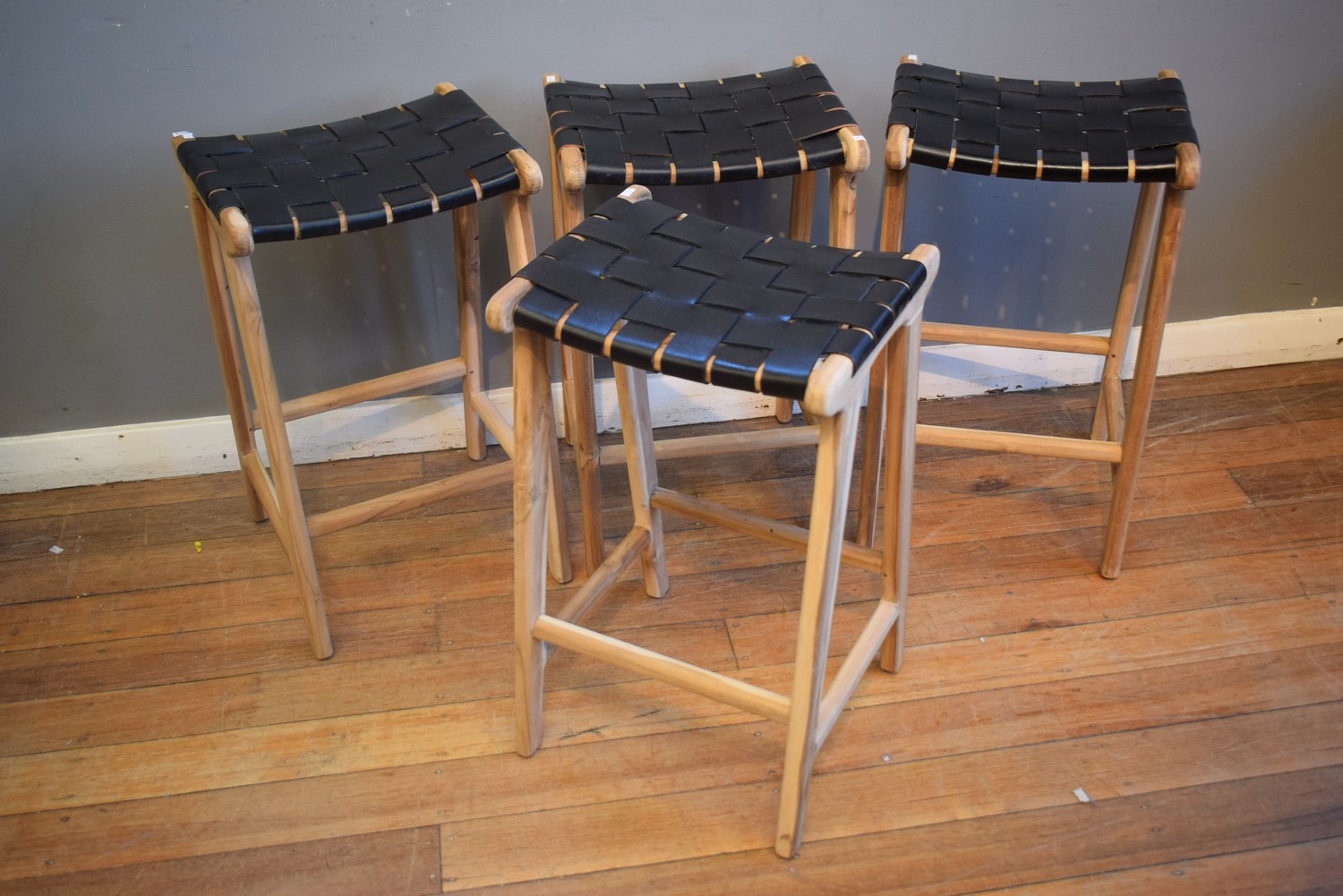 FOUR TEAK AND LEATHER WEAVE BAR STOOLS (68H X 40W X 36D CM)