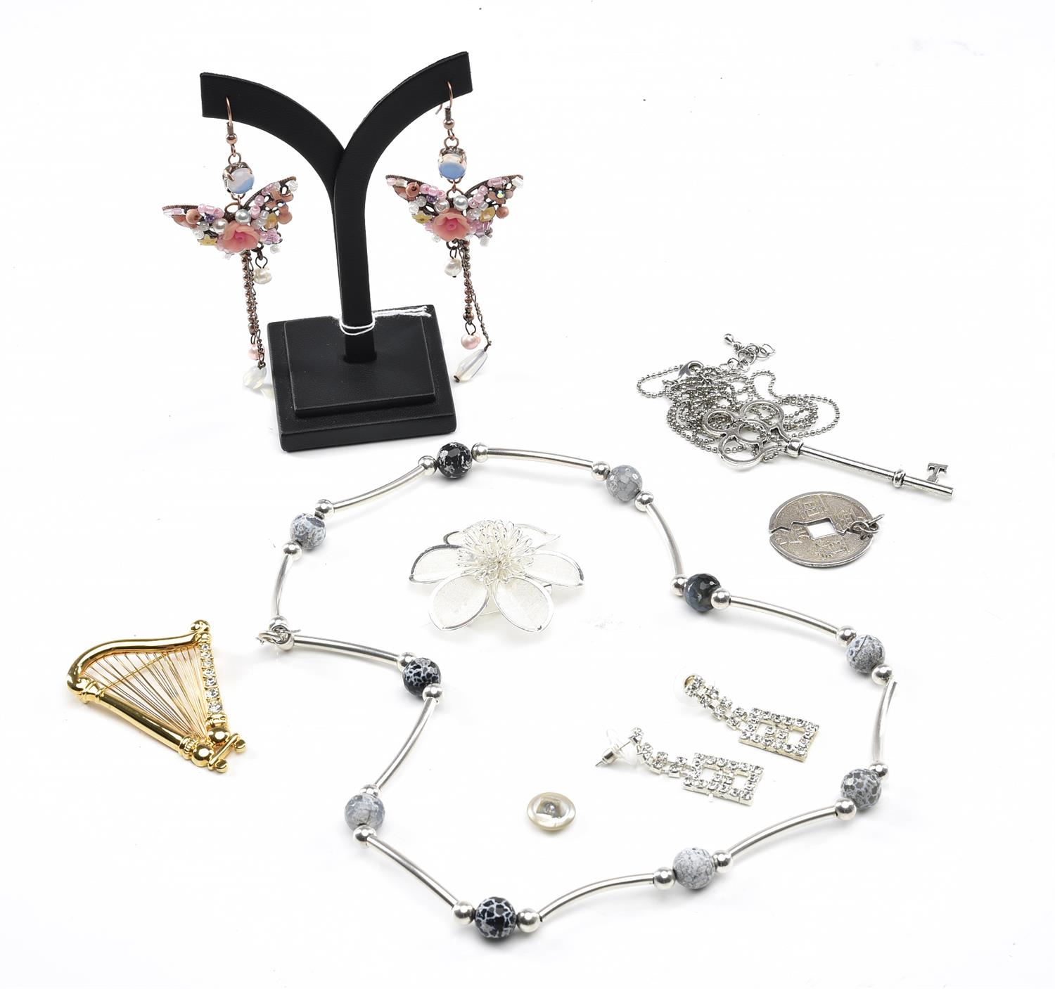 A COLLECTION OF COSTUME JEWELLERY INCLUDING A GLASS BEAD NECKLACE IN SILVER