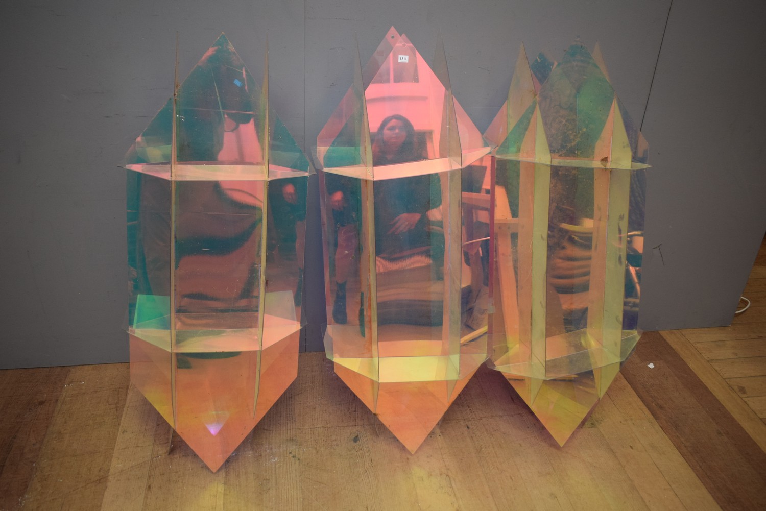 A COLLECTION OF THREE IRRIDESCENT LUCITE HANGING PIECES (A/F) (125 CM H)