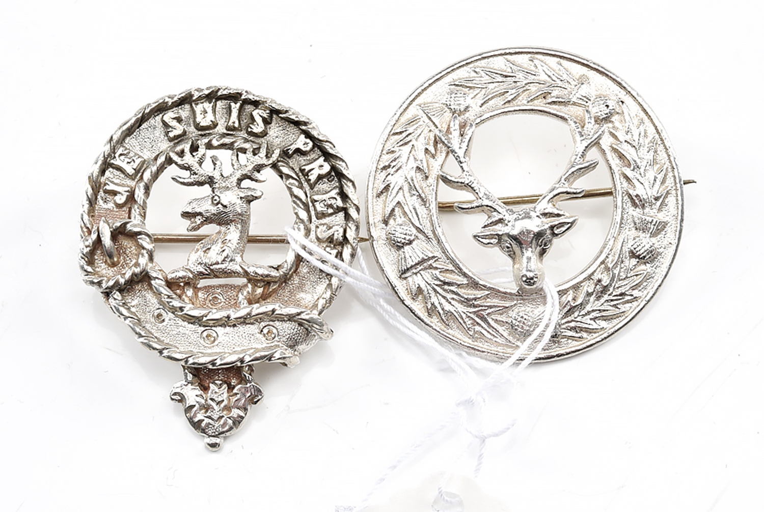 TWO SCOTTISH CLAN BROOCHES IN SILVER, COMPRISING THE CLAN FRASER FEATURING THE INSCRIPTION JE SUIS PREST AND A GORDON HIGHLANDERS FEATURING A STAG IN A SURROUND OF THISTLES