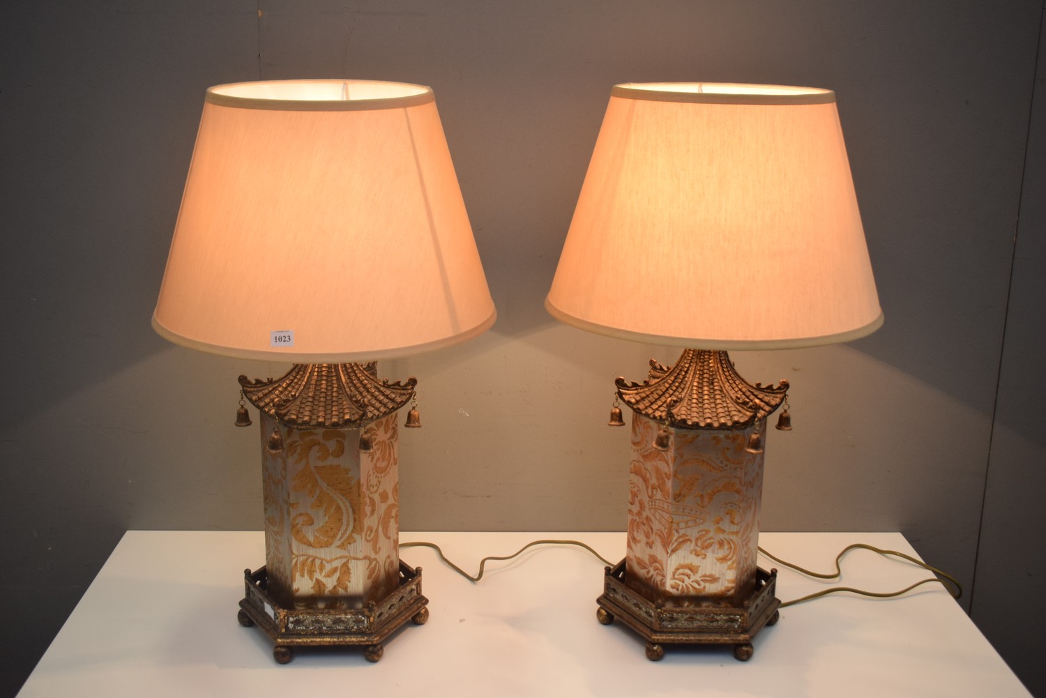 A PAIR OF CHINOISERIE STYLE LAMPS WITH GILT DETAILING (70H X 41D CM)