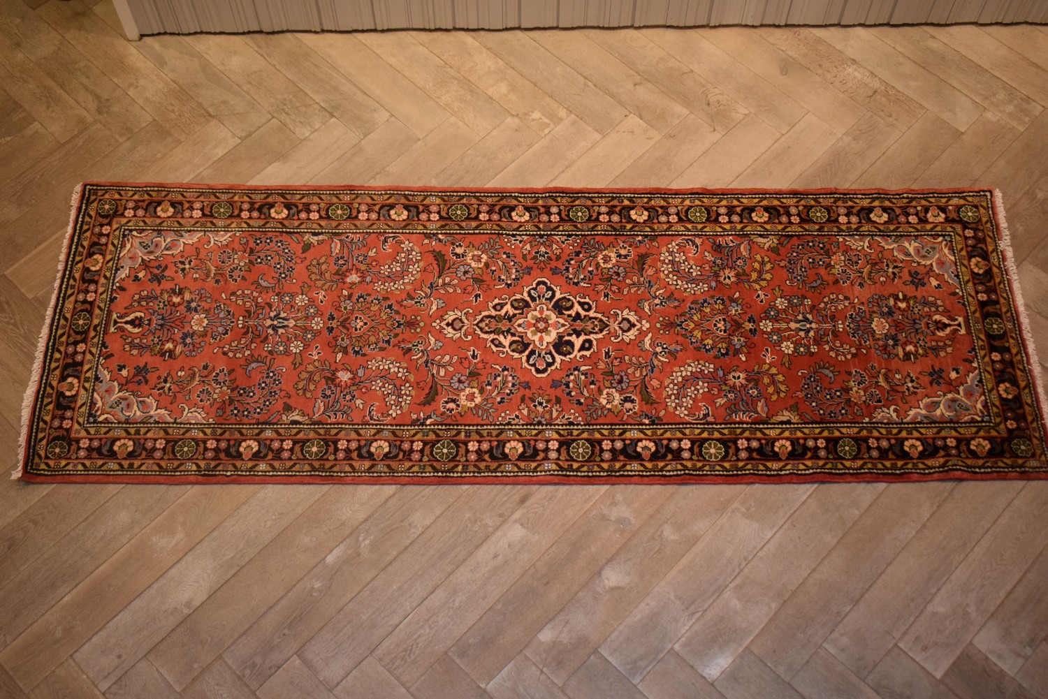 A FINELY HAND-KNOTTED PERSIAN MEHRABAN HALL RUNNER. 100% DENSE WOOL PILE. GALLERY INVENTORY. IN PRISTINE CONDITION. HARD-WEARING & DURABLE. VILLAGE WEAVE WITH CLASSIC DESIGN OF FLORAL MEDALLION IN A FIELD OF SYMMETRICAL FLORAL SPRAYS. BORDER OF FLOWER HEADS. CERTIFICATE OF AUTHENTICITY INCLUDED. SIZE: 316X110CM, ORIGIN: PERSIA – RRP: $3,300