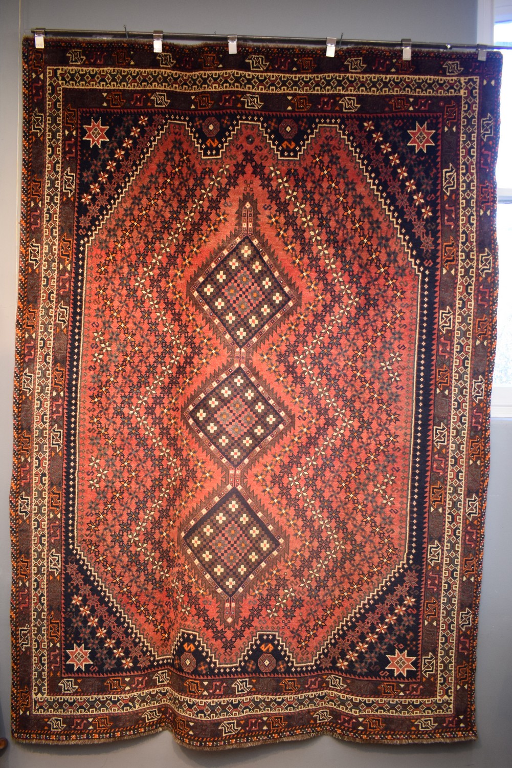 A SUPERB TRIBAL PERSIAN QASHQAIE RUG. 100% WOOL. DENSE PILE. EX-GALLERY EXHIBITED. IN PRISTINE CONDITION. FINELY HAND-KNOTTED TRIBAL WEAVE FROM THE FARS PROVINCE WITH DESIGN OF TRIPLE HOOKED MEDALLIONS IN A RED FIELD OF SECONDARY FLORAL PATTERNS. BORDER OF GEOMETRIC PATTERNS. CERTIFICATE OF AUTHENTICITY INCLUDED. SIZE: 290X204CM, ORIGIN: PERSIA – RRP: $4,400