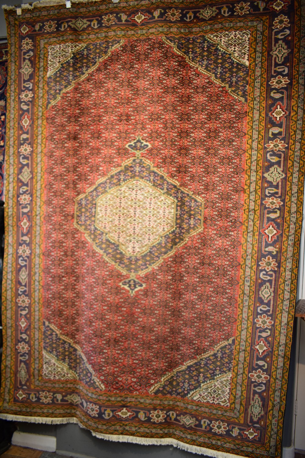 A SUPERFINE PERSIAN ARDEBIL MAHI CARPET. 100% WOOL. FINELY HAND-KNOTTED. SOLID & DENSE PILE. TRADITIONAL DESIGN OF ANCHORED HEXAGONAL MEDALLION & CORNER MEDALLION IN A FIELD OF INTRICATE HERATI MAHI PATTERNS. BORDER OF ROSETTES. EX-GALLERY INVENTORY. CERTIFICATE OF AUTHENTICITY INCLUDED. SIZE: 286X200M, ORIGIN: PERSIA – RRP: $4,900