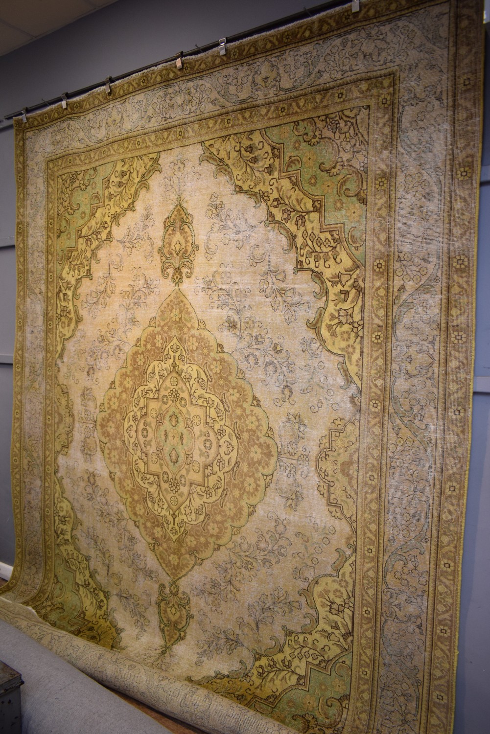A LARGE MODERN OVER-DYED VINTAGE PERSIAN TABRIZ CARPET. EX-GALLERY STOCK. AN ORIGINAL HAND-KNOTTED PERSIAN TABRIZ CARPET, KNOTTED USING HAND SPUN WOOL ON STRONG COTTON WARPS WITH THE PILE SHORN DOWN. THE RUG IS OVER-DYED IN COLOUR-FAST CREAM, BROWN, GREEN & CHAMPAGNE-TONED DYES. AS SEEN IN VOGUE & HOME DÉCOR MAGAZINES. CERTIFICATE OF AUTHENTICITY INCLUDED. SIZE: 383X292CM, ORIGIN: PERSIA – RRP: $8,900