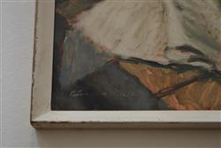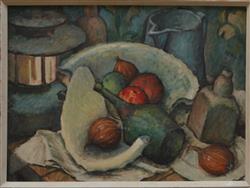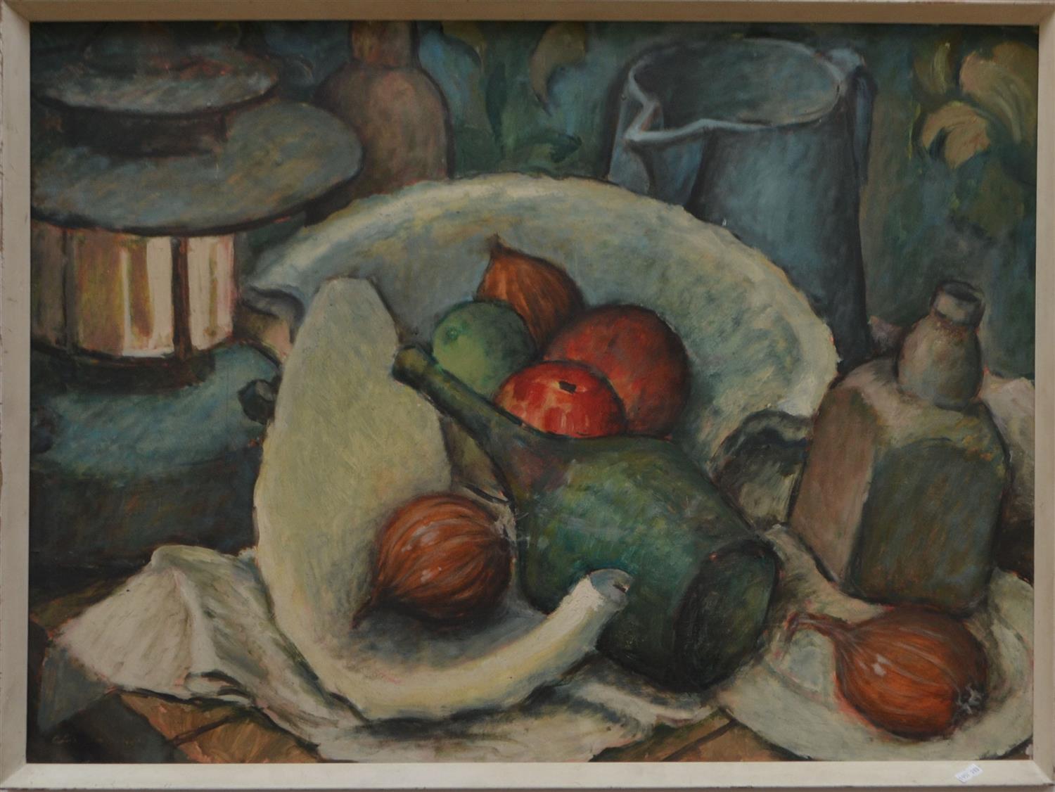 SIGNED INDECIPHERABLY, STILL LIFE, OIL ON BOARD, 60 X 80CM, FRAME SIZE: 64 X 84CM, CONDITION: CRACKING THROUGHOUT, PAINT LOSSES AND SURFACE DUST, WEAR TO EDGES OF FRAME