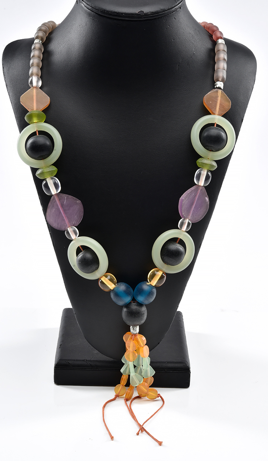 A DESIGNER TASSLE NECKLACE WITH COLOURED BEADS, LENGTH 53CM
