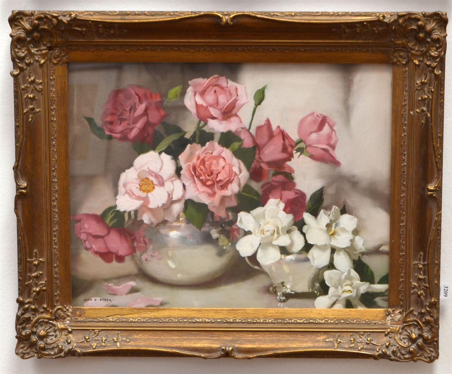 ALAN BAKER, ROSE AND GARDENIA FLOWER PIECE, OIL ON BOARD, SIGNED LOWER RIGHT, TITLED ON LABEL VERSO, 39.5 X 50CM