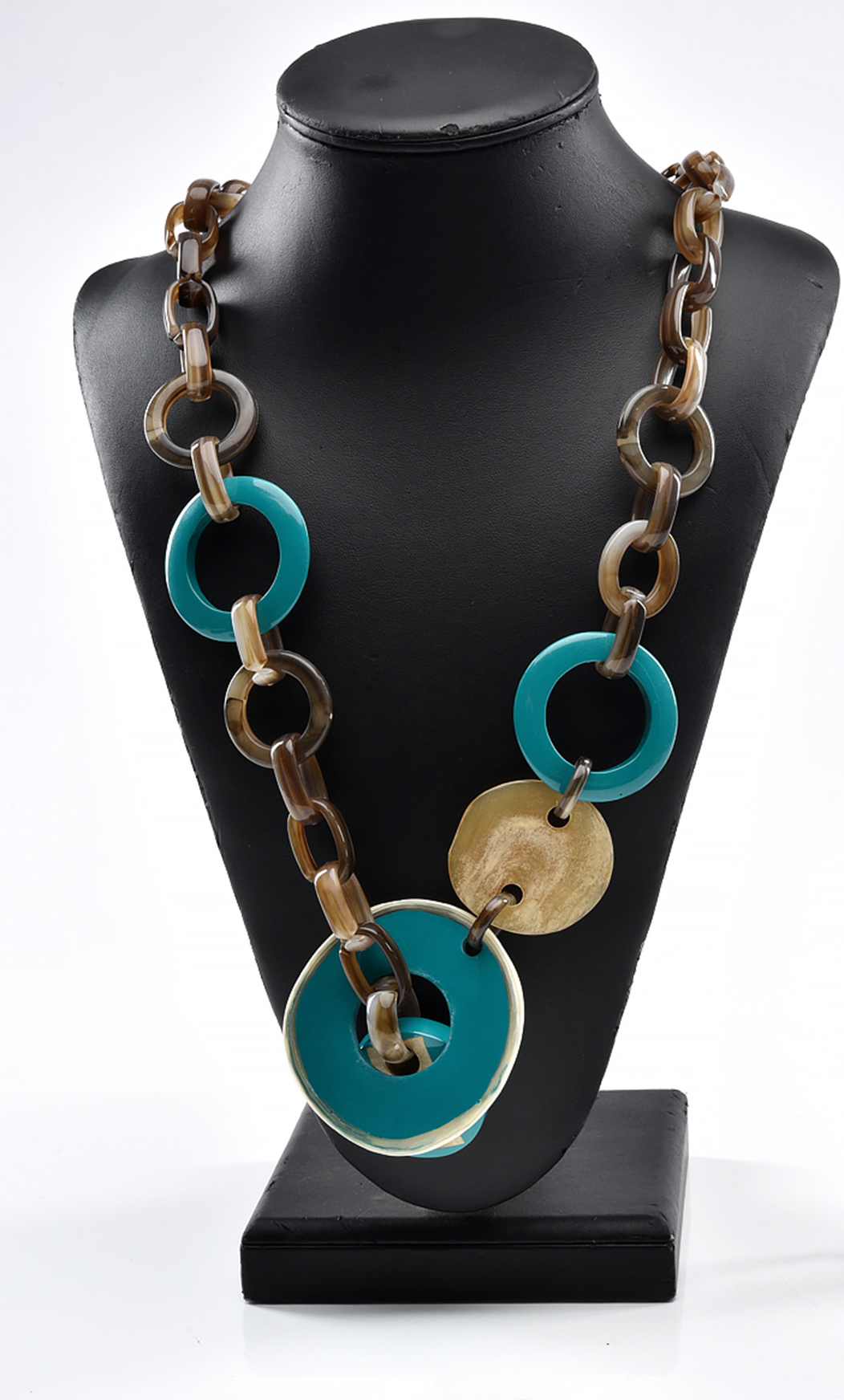 A DESIGNER LONG NECKLACE WITH GEOMETRIC MOTIFS IN RESIN