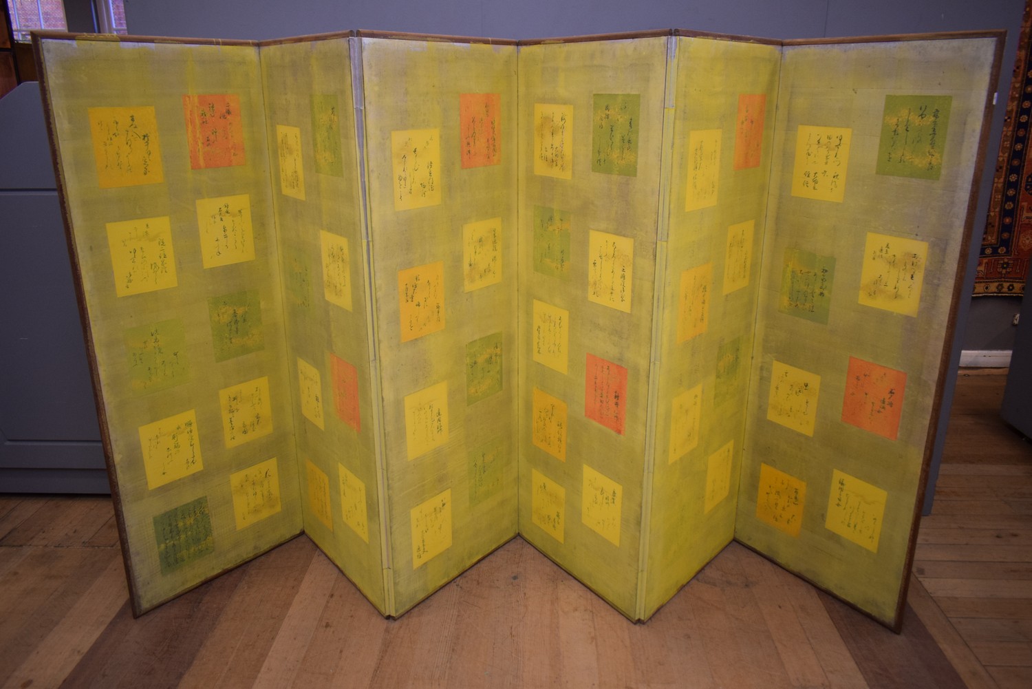 A SIX PANEL JAPANESE SCREEN WITH TEXT (A/F) (162H X 64 CM EACH PANEL)