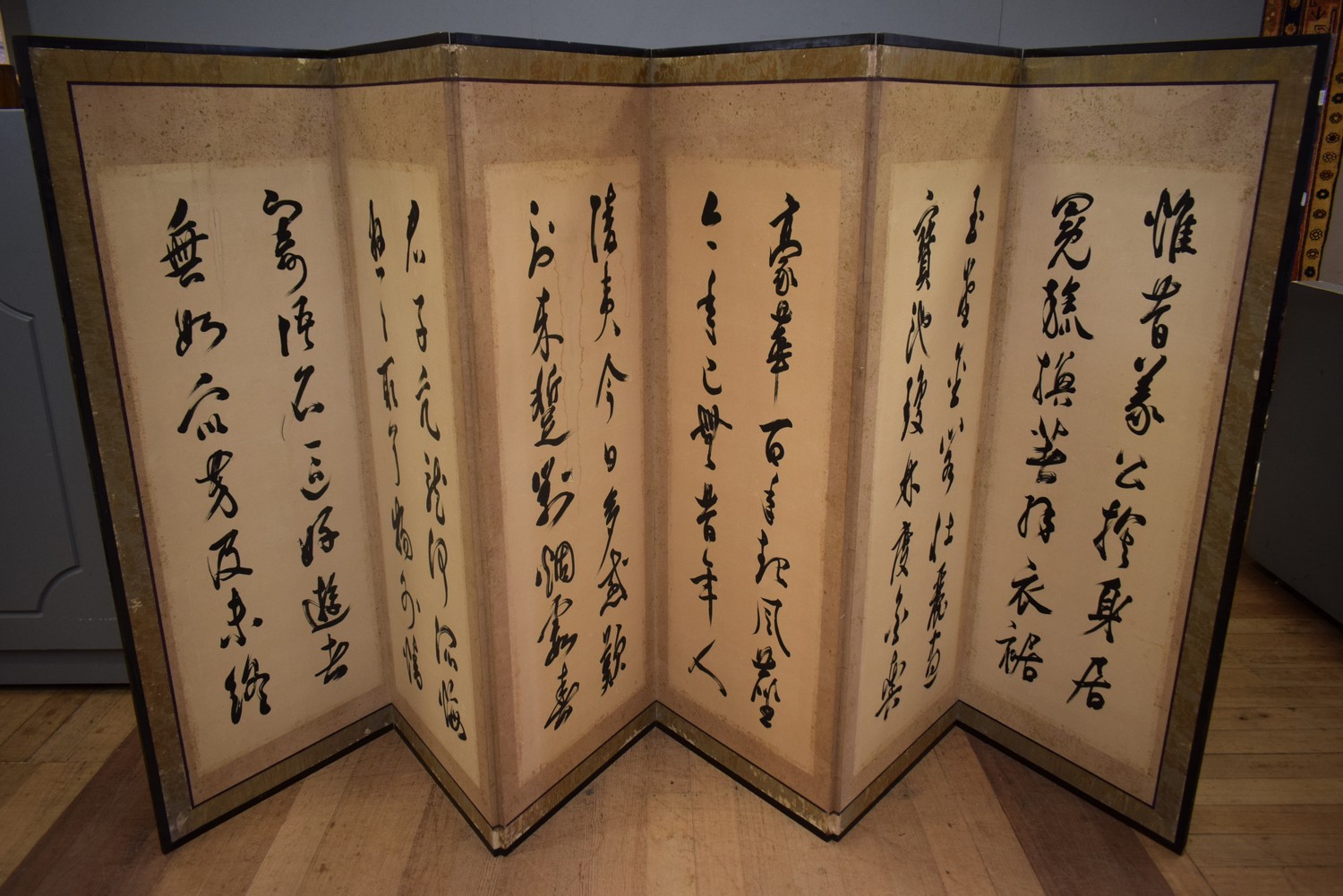 A JAPANESE SIX PANEL FOLDING SCREEN WITH TEXT (173H X 64W CM)