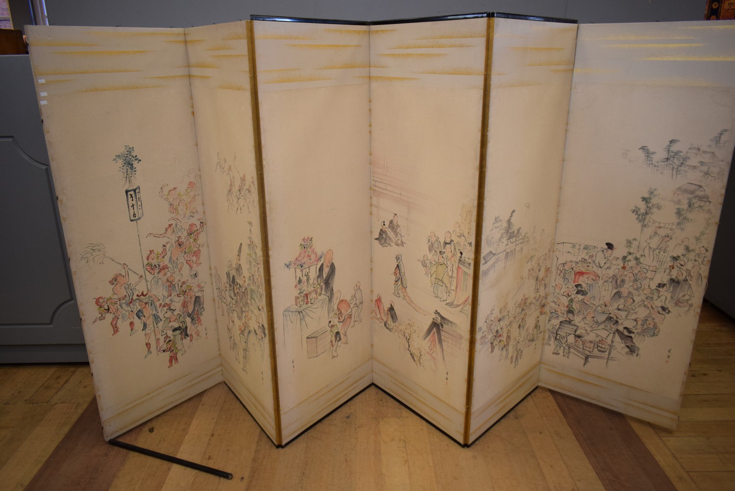 A JAPANESE SIX PANEL FOLDING SCREEN WITH FIGURES (A/F) (171H X 61 CM EACH PANEL)