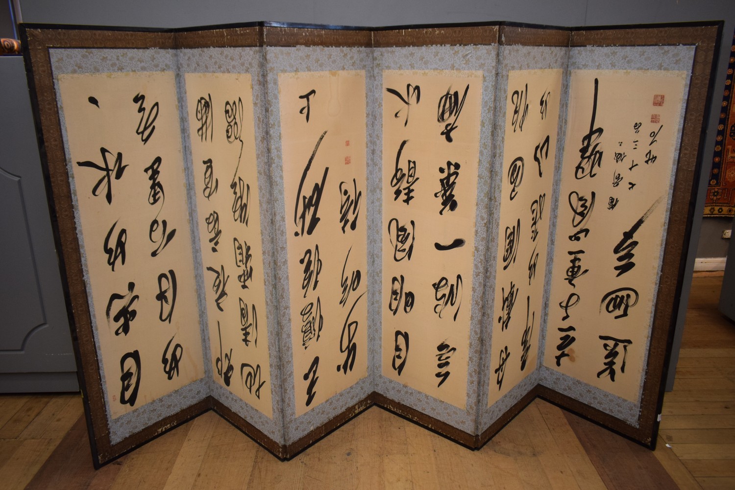 A JAPANESE SIX PANEL SCREEN WITH TEXT (A/F) (170H X 57D CM)
