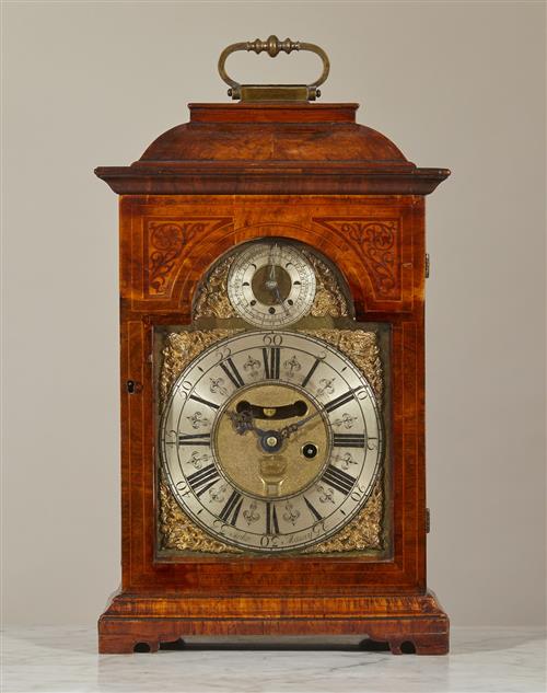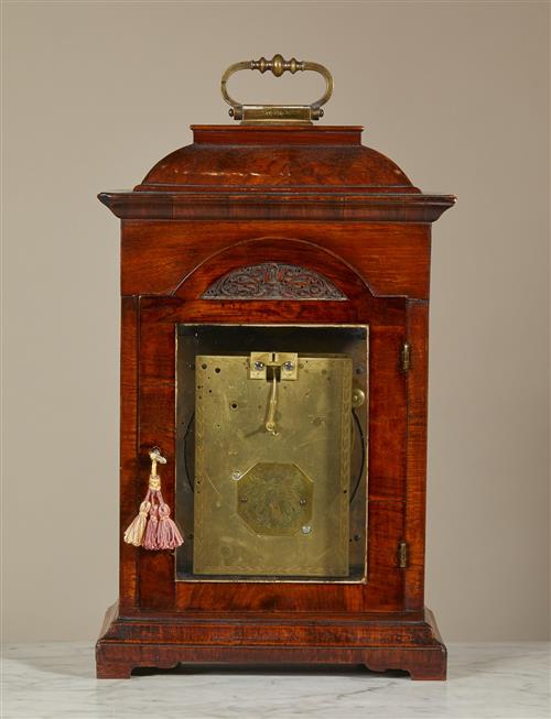 The domed case with brass handle above an arched door with seaweed marquetry spandrels, the movement by John Massey with silvered chapter ring, Roman numerals and Arabic minutes below the moon phase and calendar dial, with 8 day fusee movement, anchor escapement.