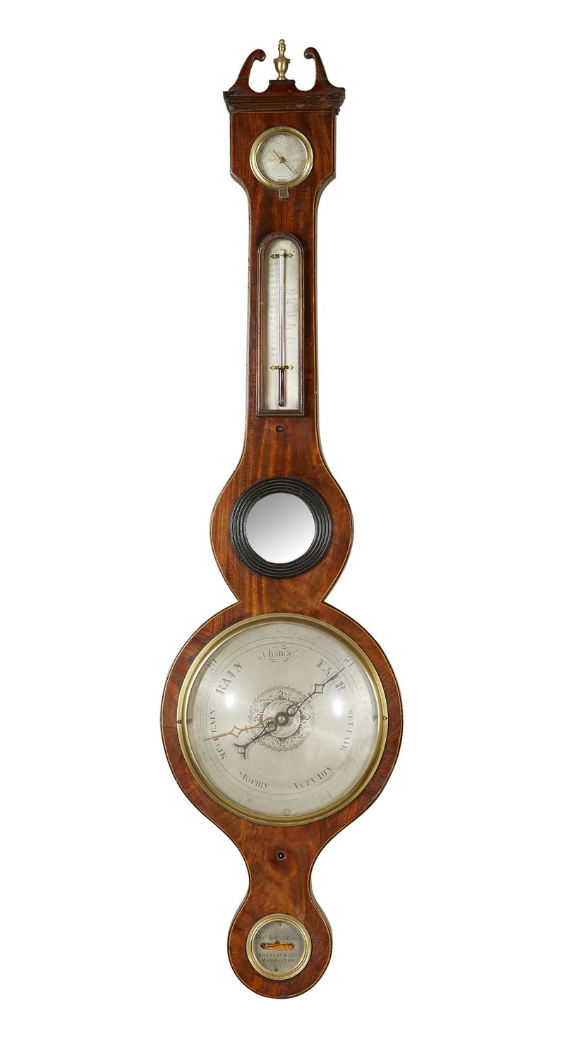 With scroll pedimented top above a silvered hygrometer dial, arched thermometer, ebonised framed convex glass, and an engraved silvered dial, the spirit level inscribed 'FRAS.BARNASCONI ABERGAVENNY WARRANTED'.