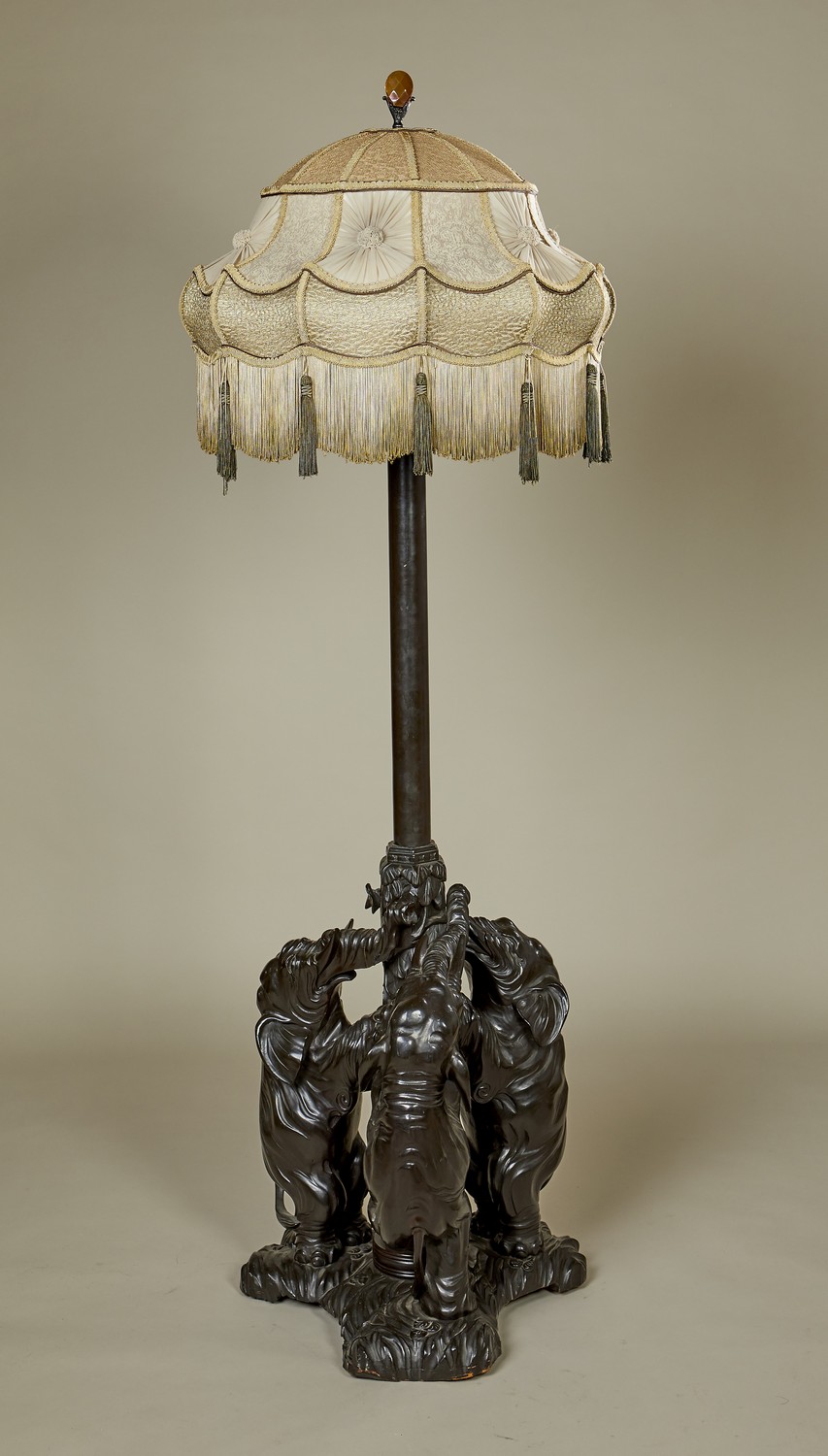 The elaborately ruched shade with facetted glass finial, on a turned shaft supported by three rearing elephants.