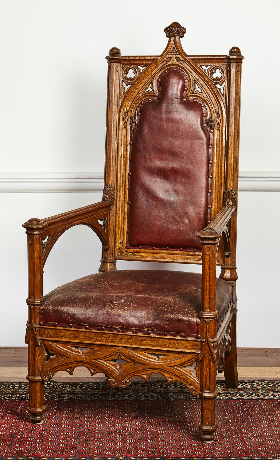 The rectangular padded back with a central ogival trefoil arch flanked by carved and pierced trefoils, the moulded arms with arched supports, on architectural legs joined by a pierced gothic apron.