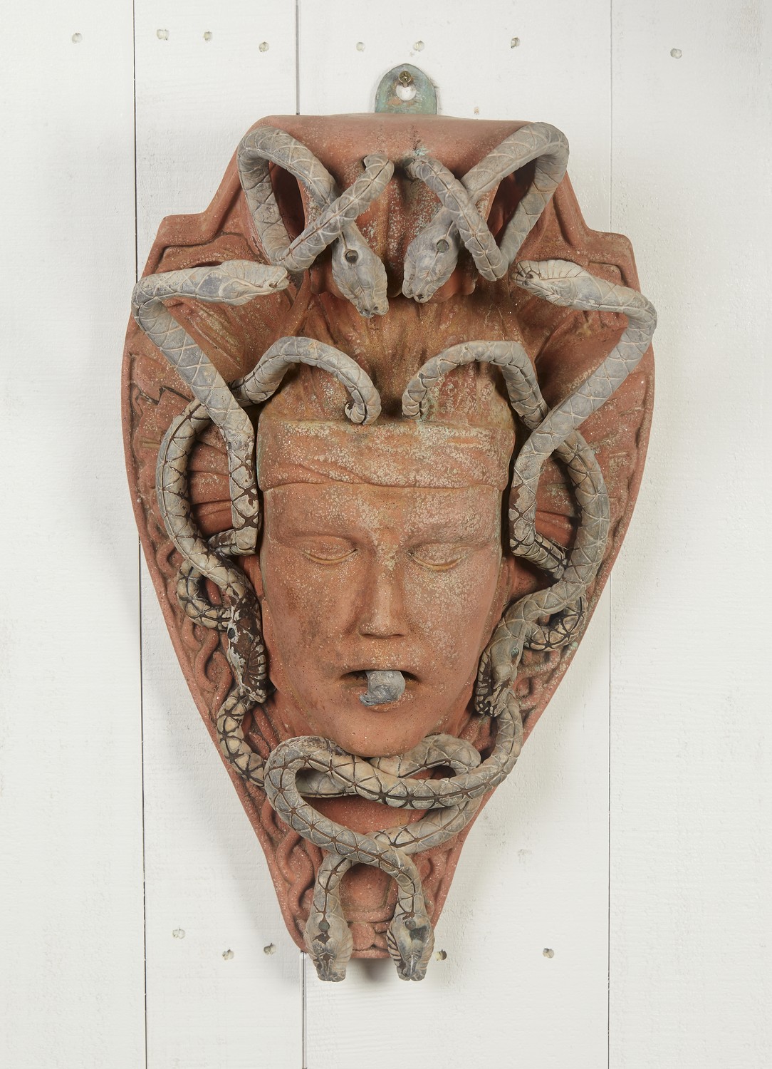In very good condition with age expected discolouration to both the terracotta and the lead, missing element at mouth.