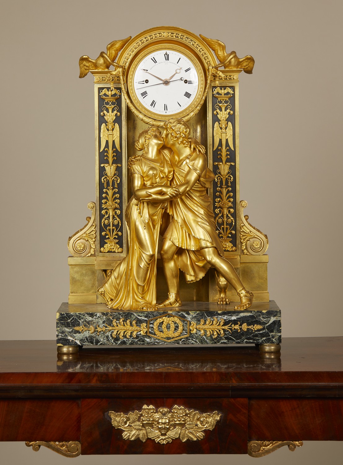 The double fusee movement by Bentley and Beck, Royal Exchange, London having white enamel dial with Roman numerals, gilt hands and blued steel seconds hand, the case in the form of an arched aedicule the dial supported by a pair of swans holding a garland, flanked by bronze pilasters with winged herm and foliate scroll motifs above a bench supported by winged lion monopodiae and a pair of classical lovers kissing; on a green marble plinth with gilt thyrsos and wreath mounts and bun feet.