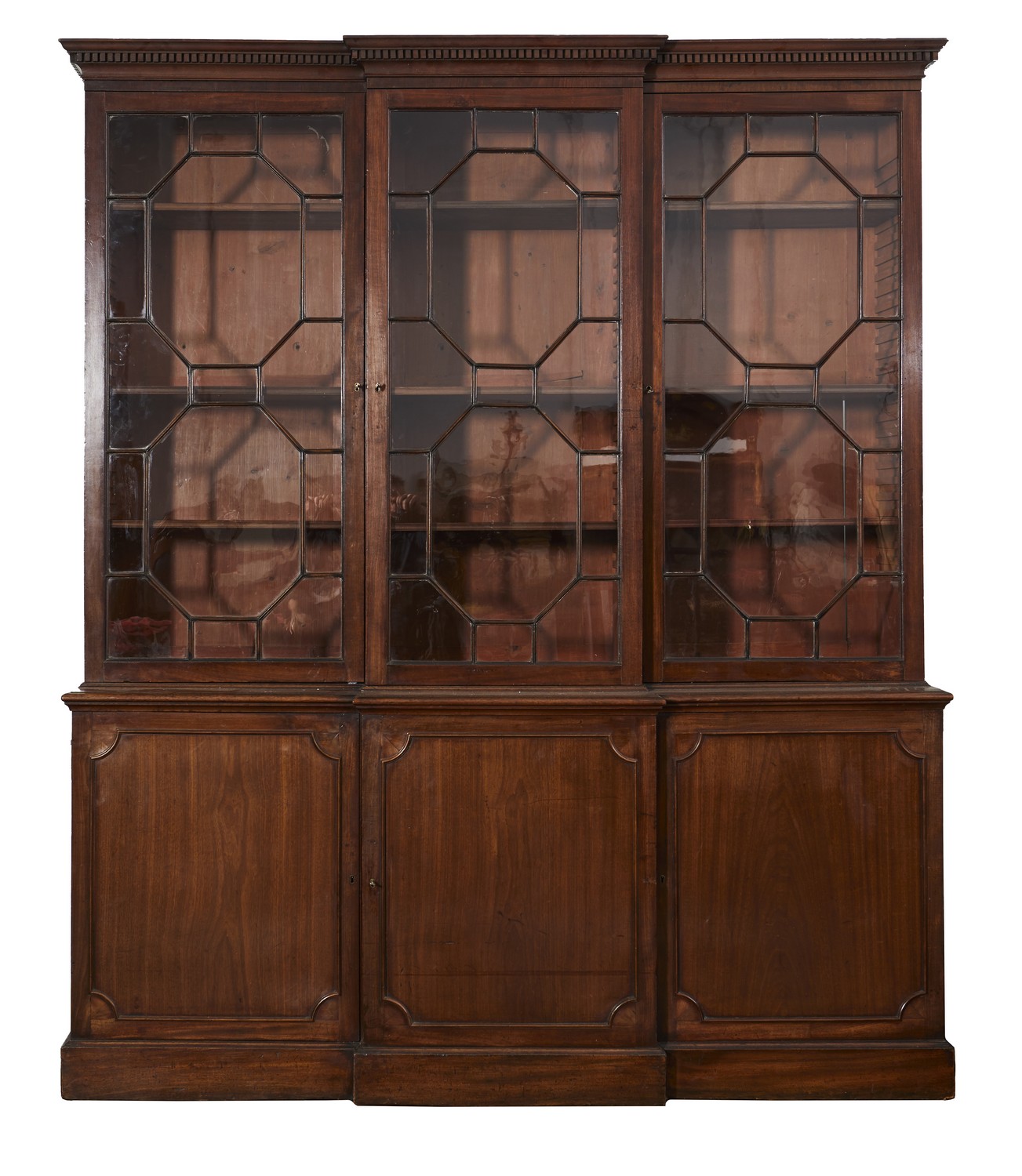 Having a moulded and dentil cornice above three astragal glazed doors enclosing adjustable shelves, the base with three coupboards with re-entrant moulded panels, on a plinth base.
