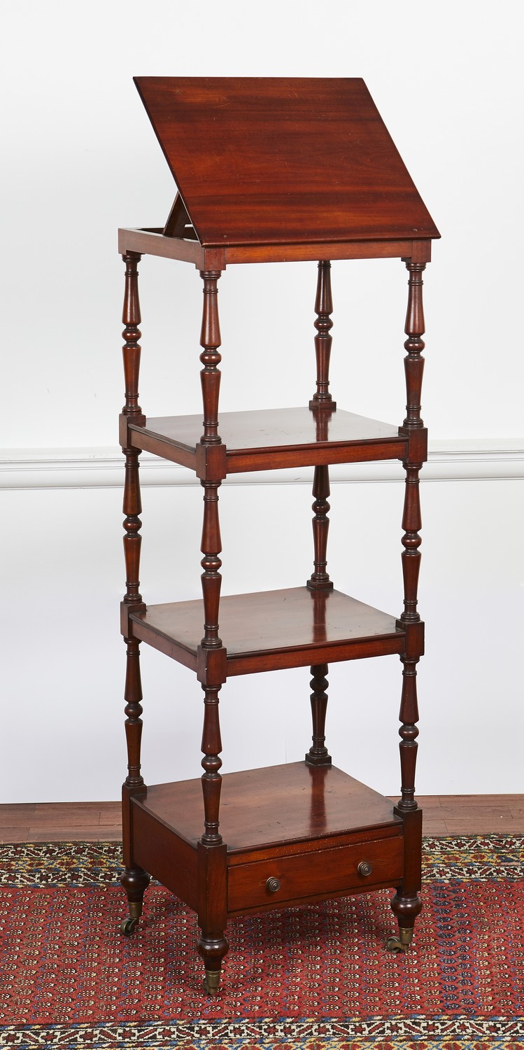 Having a rising top with reading stand, each tier with double baluster turned supports the lowest with a drawer, on short turned legs with castors.